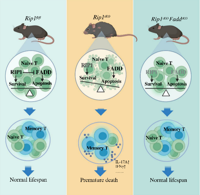 Receptor-Interacting Protein Kinase 1(RIP1/RIPK1)是決定細胞死亡與存活的關鍵調控蛋白,研究人員通過構建T細胞特異性敲除RIP1基因的小鼠(Rip1tKO),發現Rip1tKO小鼠相對于同齡的野生型小鼠,呈現出系統性的早衰特征,包括過度的炎癥,弓背,毛發稀疏,身體機能下降,骨質疏松、肌少癥等多種與年齡相關的表型,同時行為及認知能力出現顯著下降,壽命也較野生型小鼠顯著縮短。機制研究發現RIP1的缺失導致T細胞的凋亡增加,并促進T細胞向TH1和TH17亞型分化,誘導組織器官炎癥水平增高,進一步促進組織器官衰老標志物表達升高。通過在Rip1tKO小鼠的基礎上進一步構建Fadd基因敲除的小鼠阻斷T細胞的凋亡,發現FaddtKORip1tKO雙基因敲除小鼠能夠恢復外周原始T細胞以及記憶T細胞穩態平衡,并能逆轉Rip1tKo小鼠的胸腺萎縮以及全身系統性的早衰表型,同時延長Rip1tKo小鼠的壽命至野生型小鼠水平,而阻斷T細胞的程序性壞死小鼠(Rip1tKoRip3-/-Rip1tKoMlkl-/-)卻仍表現出與Rip1tKo小鼠相似的系統性衰老表型,提示Rip1tKO小鼠是T細胞過度凋亡導致外周原始T細胞的減少以及記憶T細胞的比例增加,促進了組織的炎癥水平升高及組織細胞衰老,最終導致個體全身系統性的早衰發生。