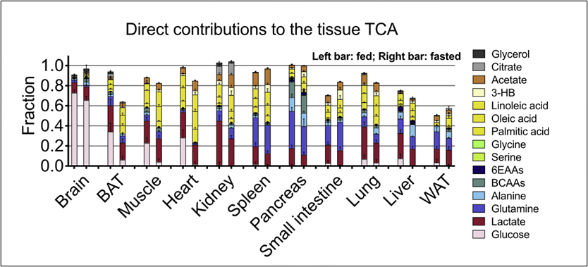 ????圖6. [U-13C]-營養物作為示蹤劑研究各營養物對于各個組織器官的三羧酸循環的代謝流計算結果。